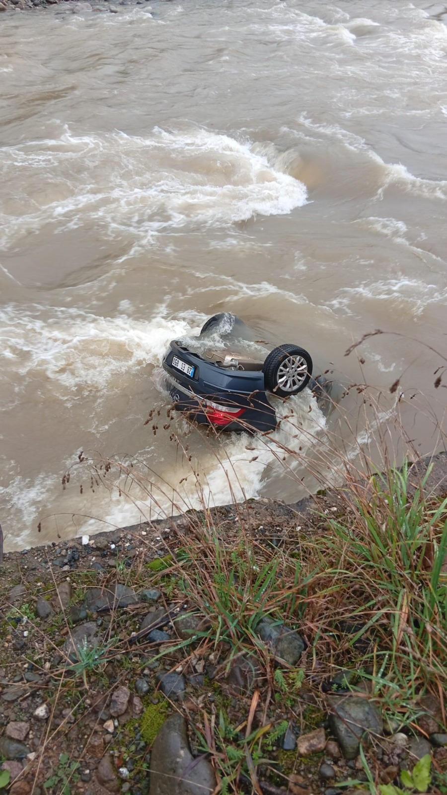 Debisi yüksek olan derede araçtan savrulup, akıntıya kapılan sürücü Yılmaz gözden kaybolurken, yanındaki dayısı Raif Şimşek otomobilde sıkıştı. İhbarla kaza yerine AFAD, sağlık, itfaiye ve jandarma ekipleri sevk edildi.