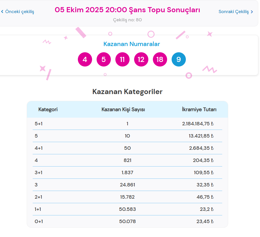 5 Ekim 2025’te gerçekleşen çekilişin ardından kazanan numaralar belirlendi. 5+1 bilen şanslı kişi, 2.184.184,75 TL ikramiye kazandı.