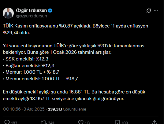 Erdursun, “En düşük emekli aylığı 18.957 TL seviyesine çıkacak gibi görünüyor” ifadesini kullanarak tahminini sosyal medya hesabı üzerinden paylaştı.