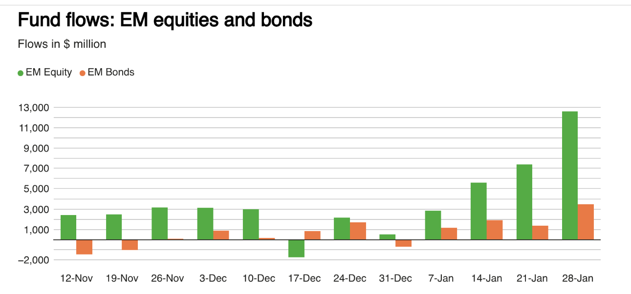 Özet: Küresel hisse senedi fonları, olumlu kâr beklentileriyle 28 Ocak haftasında üst üste üçüncü kez net para girişi sağladı.
