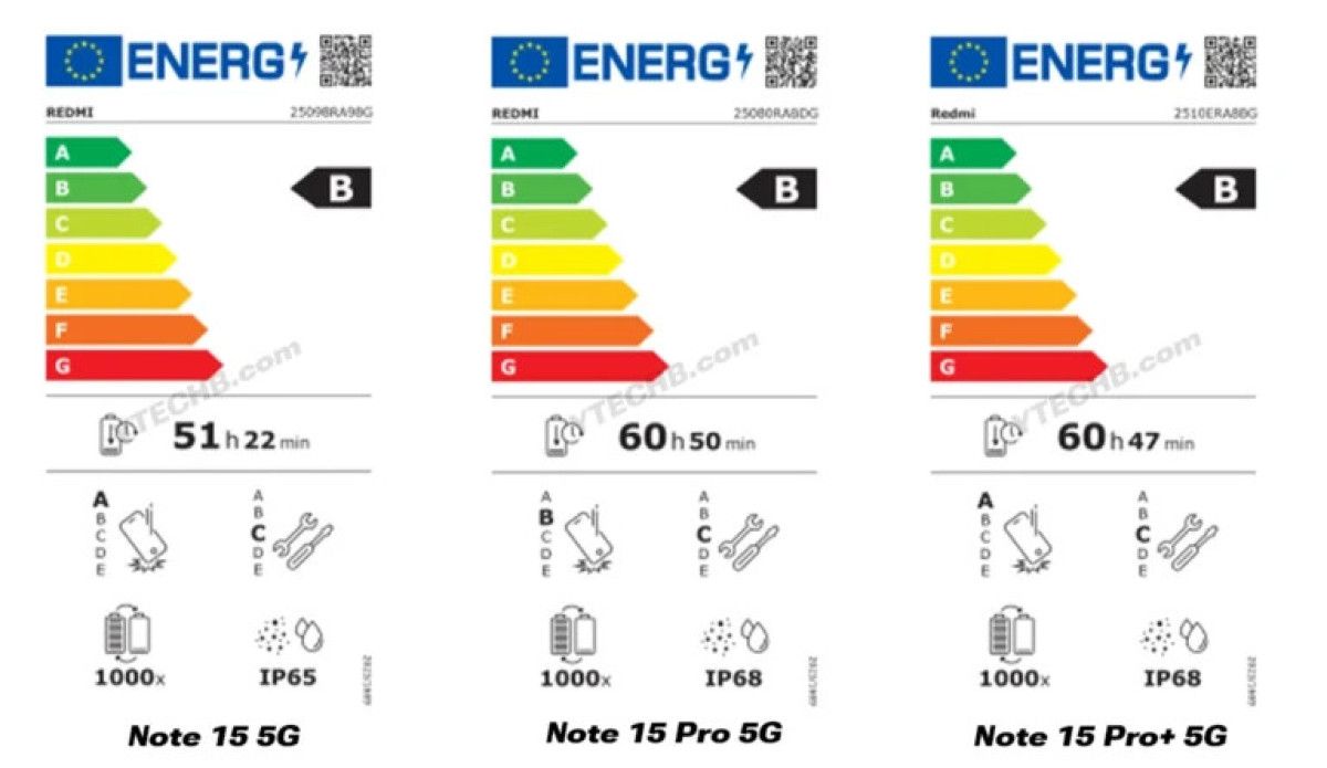 Avrupa Enerji Etiketleme Ürün Kaydı verilerine göre serinin orta modeli Note 15 Pro, 6.580 mAh kapasiteli bataryasıyla tek şarjda 60 saat 50 dakikaya kadar kullanım sunarak öne çıkıyor.