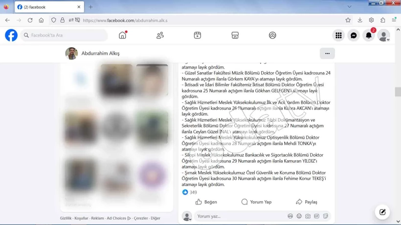 – Şırnak Meslek Yüksekokulumuz Özel Güvenlik ve Koruma Bölümü Doktor Öğretim Üyesi kadrosuna 30 Numaralı açtığım ilanla Fehime Konur TEKEŞ’i atamayı layık gördüm.”