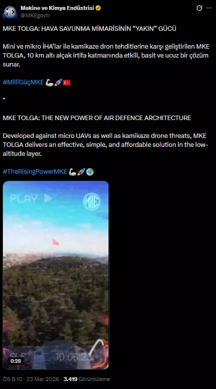Makine ve Kimya Endüstrisi AŞ (MKE), TOLGA yakın hava savunma sisteminin, İHA’lar ve kamikaze dronlarını etkisiz kıldığına dair görüntüleri paylaştı. MKE’nin sosyal medya hesabından yapılan açıklamada, “MKE TOLGA: Hava savunma mimarisinin ‘yakın’ gücü. Mini ve mikro İHA’lar ile kamikaze dron tehditlerine karşı geliştirilen MKE TOLGA, 10 kilometre altı alçak irtifa katmanında etkili, basit ve maliyet açısından avantajlı bir çözüm sunmaktadır.” ifadeleri yer aldı. Ayrıca, TOLGA’nın bu tehditleri etkisiz hale getirdiğine dair görüntülere de yer verildi.